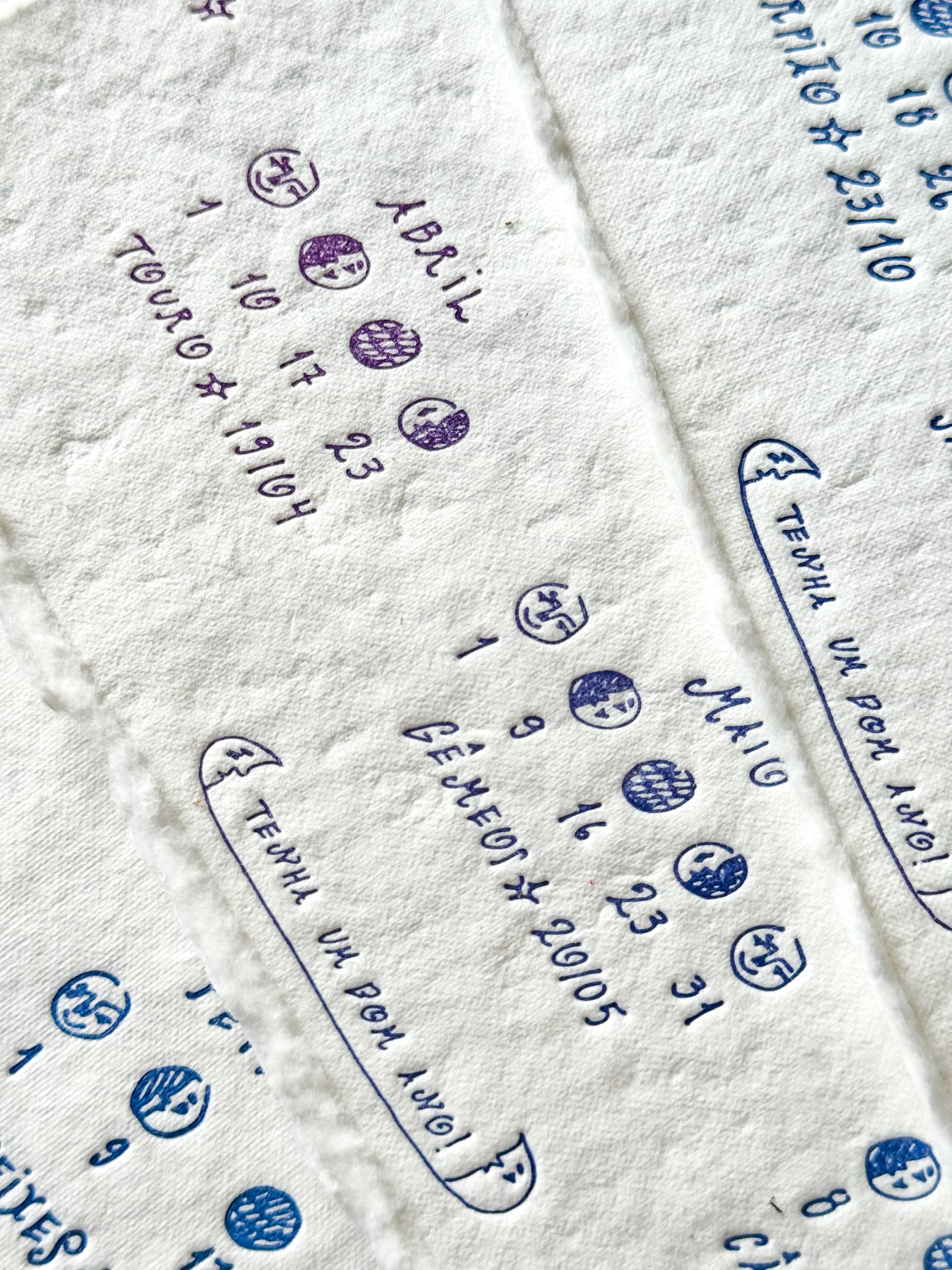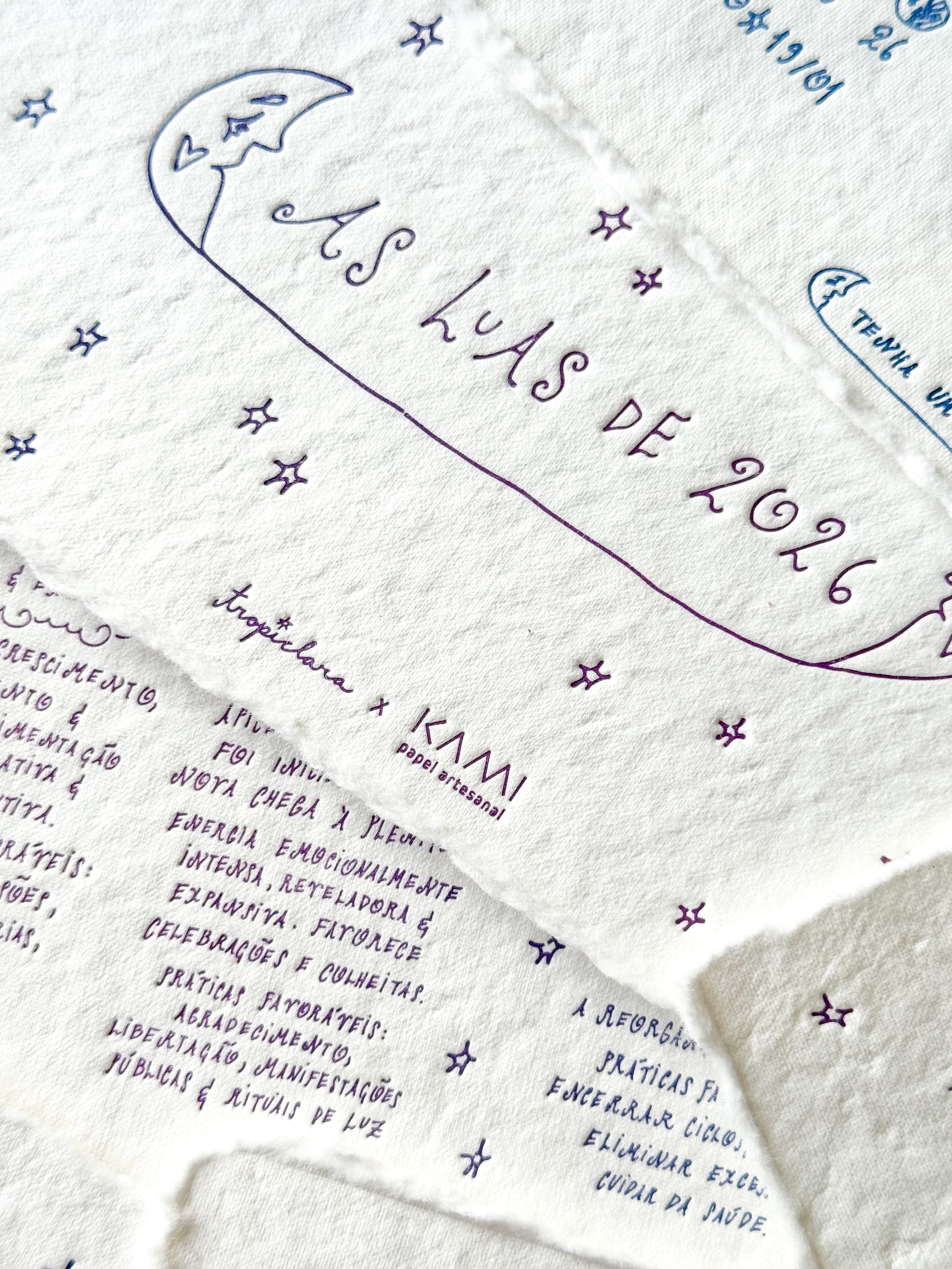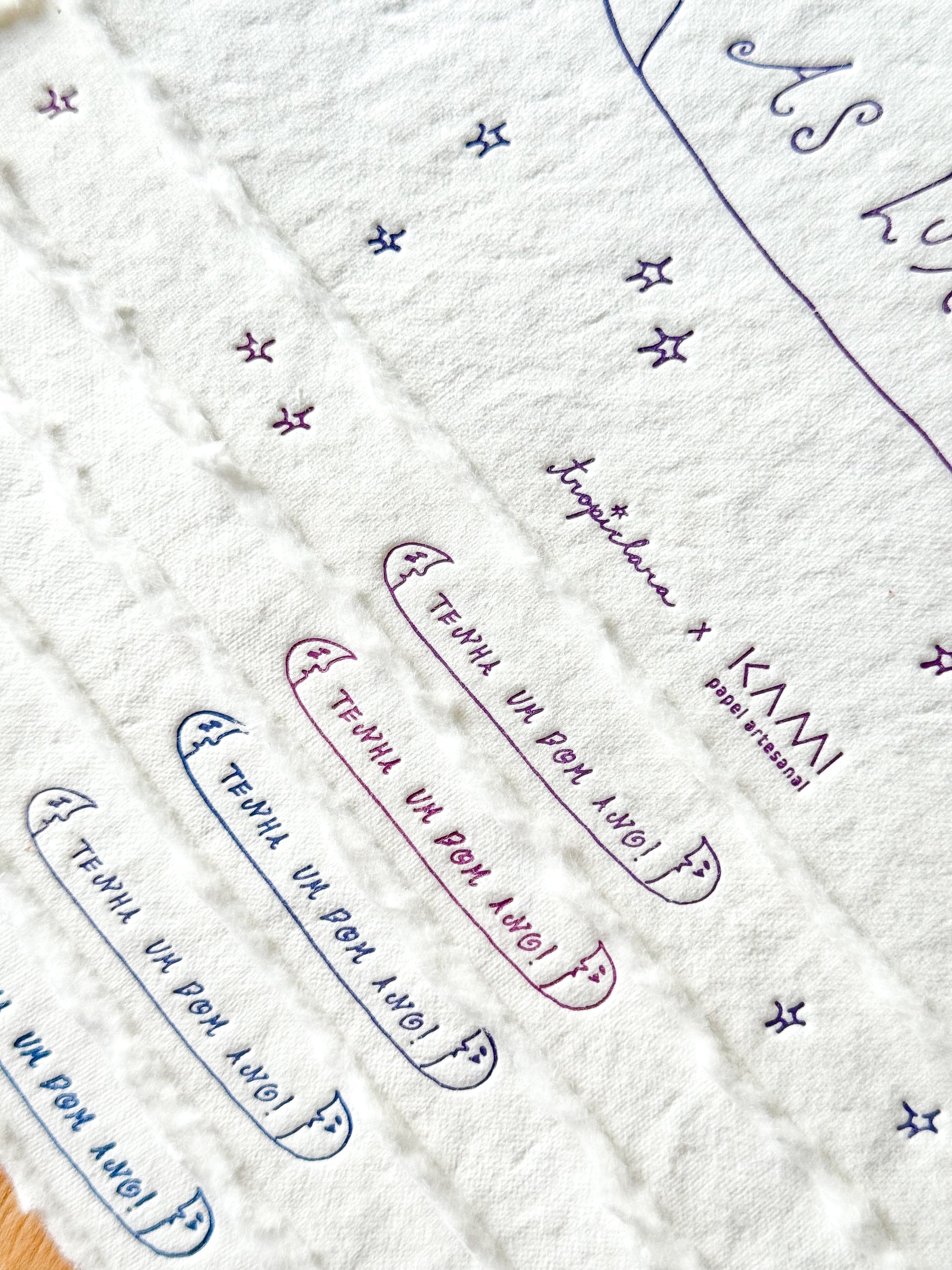 Estampado no papel de algodão da Kami, ele é produzido com a técnica do letterpress: um processo em que uma prensa pressiona uma superfície entintada contra o papel, transferindo a tinta e criando um delicado baixo-relevo que confere textura e profundidade à impressão. Ao escolher a tinta, fiquei em dúvida entre o azul e o roxo, então fizemos nesse degradê que torna cada folha única. Muito chic!